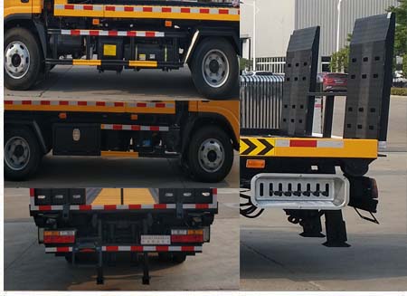 (2)新款翻转尾板:一拖二型(3P1)冲压式平板,板上开孔,平板长度为4.2米,宽2.3米,后部一块1米长的液压自动翻转尾板,加装前配重。双侧联动操作装置,后工作灯3只,1个40KN液压绞盘,25米钢丝绳,2个工具箱,1个洗手箱,配2个辅助轮小车,1对L型抱胎架,4根新款捆绑带,1对托叉,1对托叉座,1条链钩,其余标配。