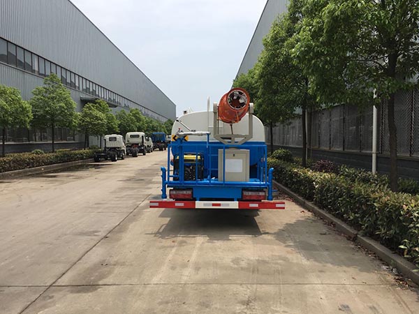 改装配置:罐体容积8.5-10.4立方,罐体用4MM碳钢板制作,罐内隔板具有防波作用,以减低汽车行驶时罐体液体的冲击。整车带一个专用洒水泵(垂直 大吸程6米),洒水宽度14米,射程28米。多功能洒水车配备2个前冲(喷)(能将路面泥巴、尘土、垃圾冲干净);2个后洒(能均匀地将水洒在路面,一次洒水宽度14米)、2个侧喷(花洒)(能均匀地将路旁绿化带浇灌)、带1个后工作平台,平台上安装1个绿化洒水高炮(洒水炮可全方位旋转,可连续调成直冲状、大雨、小雨、毛毛雨,雾状可调节冲洗高大树木),引水时间<5min,流量90m3/h。带1个消防接头,带1个自流阀,1个过滤装置、人性化爬梯及侧防护栏,安装洒水音乐喇叭。